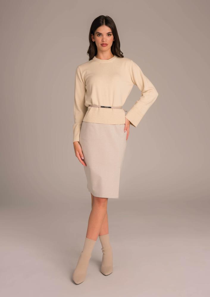 Béžový, elastický pletený purpurový svetr, volného střihu, s kulatým výstřihem. Na rukávu je přišitý kovový purpurový branding.